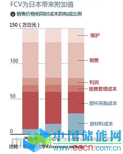 右表是汽油車、FCV、EV的售價(jià)在150萬日元時(shí)的成本構(gòu)成比例。尤其值得一提的是,F(xiàn)CV的價(jià)格中,依賴進(jìn)口的“原材料費(fèi)用”這一項(xiàng)所占比重較少,而大多在日本采購的“部件采購費(fèi)用”所占比例與汽油車一樣多。