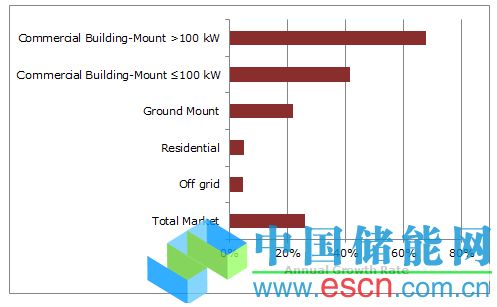 裝機(jī)規(guī)模在100KW以下的小型商業(yè)應(yīng)用預(yù)計將同比增長約40%,而大型商業(yè)項目的年增長率將達(dá)到70%,與地面光伏系統(tǒng)相比,增長率分別達(dá)到兩倍和三倍。