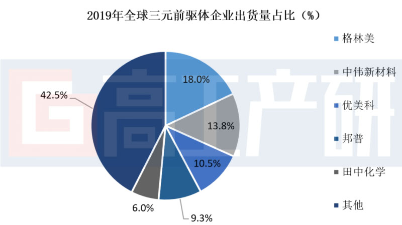 2019年全球三元前驅(qū)體市場出貨量33.4萬噸,同比增長45.2%。三元前驅(qū)體市場的速增長主要受全球三元正極材料市場帶動。從市場競爭格局角度分析,2019年全球三元前驅(qū)體市場CR3市場份額占比42.2%,CR5市場占比接近57.5%;從企業(yè)端出貨量市場占比來看,2019年全球三元前驅(qū)體市場出貨量前三的的企業(yè)為格林美、中偉新能源以及廣東邦普,其中格林美、中偉新能源三元前驅(qū)體產(chǎn)品除了國內(nèi)企業(yè)自用外,還具有較大規(guī)模的出口量,出口給Ecopro、LGC、L&F等。