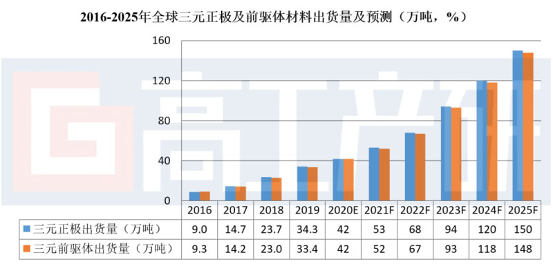 高工產(chǎn)研鋰電研究所(GGII)調(diào)研數(shù)據(jù)顯示,2019年全球三元正極材料出貨34.3萬噸,同比增長44.7%,帶動全球三元前驅(qū)體材料出貨量33.4萬噸。GGII預(yù)計2025年全球三元正極材料及前驅(qū)體出貨量將超過150萬噸。