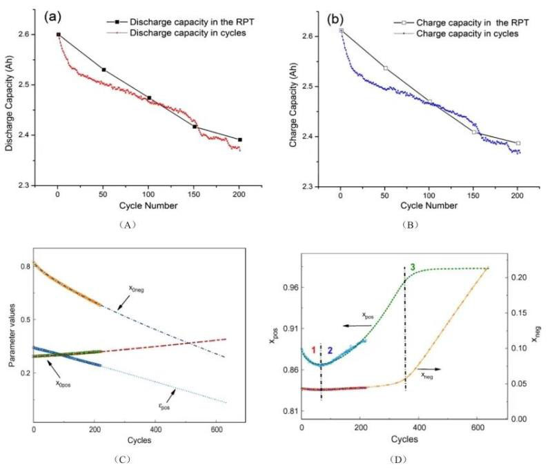此三個階段在三元電池循環(huán)曲線上通常表現(xiàn)出宏觀容量衰減“快-慢-快”現(xiàn)象(圖11 A,B)。White等從單粒子(SP)模型的微觀電化學(xué)參數(shù)變化中亦給出相同證據(jù):圖11(C)看出正極可利用活性材料比例隨循環(huán)始終下降;由圖11(D)可清晰看出老化的三個階段,1、2區(qū)域的轉(zhuǎn)折點(最低點)是LAMPE速度開始超過LLI的標(biāo)志;而在區(qū)域3中,Li+在負(fù)極化學(xué)計量數(shù)快速增加,對應(yīng)于Li+被滯留于負(fù)極中無法回到正極,同時正極材料損失仍在加深,二者共同作用使電池加速到達(dá)壽命終點。