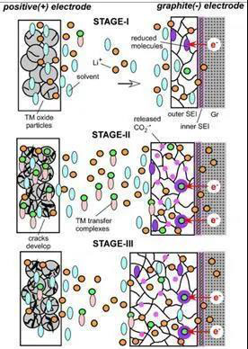 (1)“誘導(dǎo)”階段:過渡金屬離子開始溶出,并自發(fā)遷移至SEI內(nèi)層(無機(jī)層)表面,發(fā)生少量沉積,若該沉積與來自負(fù)極界面的電子接觸,還原產(chǎn)物將作為電催化劑或SEI的電子通道,使更多活性鋰被SEI捕獲,加速電池容量損失;