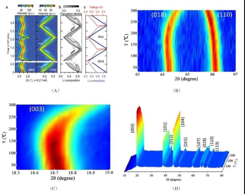 原位X射線衍射或中子衍射技術(shù)是監(jiān)測材料容量衰退過程中體相結(jié)構(gòu)變化及失效過程的有效方法,近年來多維(時空、譜學(xué)、元素、襯度分辨)多尺度(微納米)X射線成像技術(shù)高速發(fā)展。從原理上看,其對應(yīng)正極過程為: