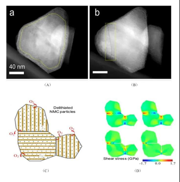 圖8 (A) 加熱前期NCM完整一次顆粒STEM結(jié)果;(B) 加熱后期由于失氧呈現(xiàn)裂紋(黃色方框內(nèi))NCM一次顆粒STEM結(jié)果;(C) 脫鋰態(tài)NCM表面晶格脫氧機(jī)理示意圖;(D)有限元法分析