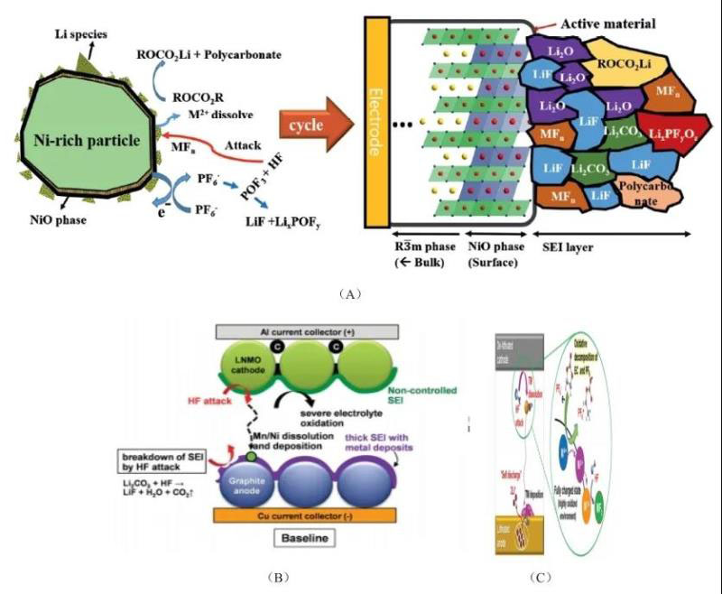 圖7 (A) 高氧化態(tài)過渡金屬離子(Mn4+,Ni4+等)被還原為低價離子并在正、負(fù)極界面生成阻抗較大的副產(chǎn)物示意圖[39];(B) 二價金屬離子在負(fù)極表面沉積后引發(fā)“自放電”行為[38] ;(C)正極-電解液界面層副產(chǎn)物