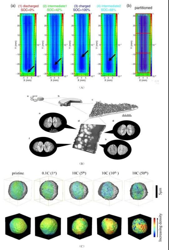 圖6 (A) (a) 0.1-0.8nm中子波下4種充電態(tài)電極透射圖像 (b) 劃分網(wǎng)格獲取Bragg edges;(B) NCM622正極材料極片X射線層析成像結(jié)果,(a)(b)為扣式電池結(jié)構(gòu)示意,(c)為正極材料X射線微區(qū)CT掃描結(jié)果,(d)為正極材料納米分辨率CT掃描結(jié)果,(e)-(h)為對不同倍率下快充一段時間后正極材料納米分辨率CT掃描 結(jié)果