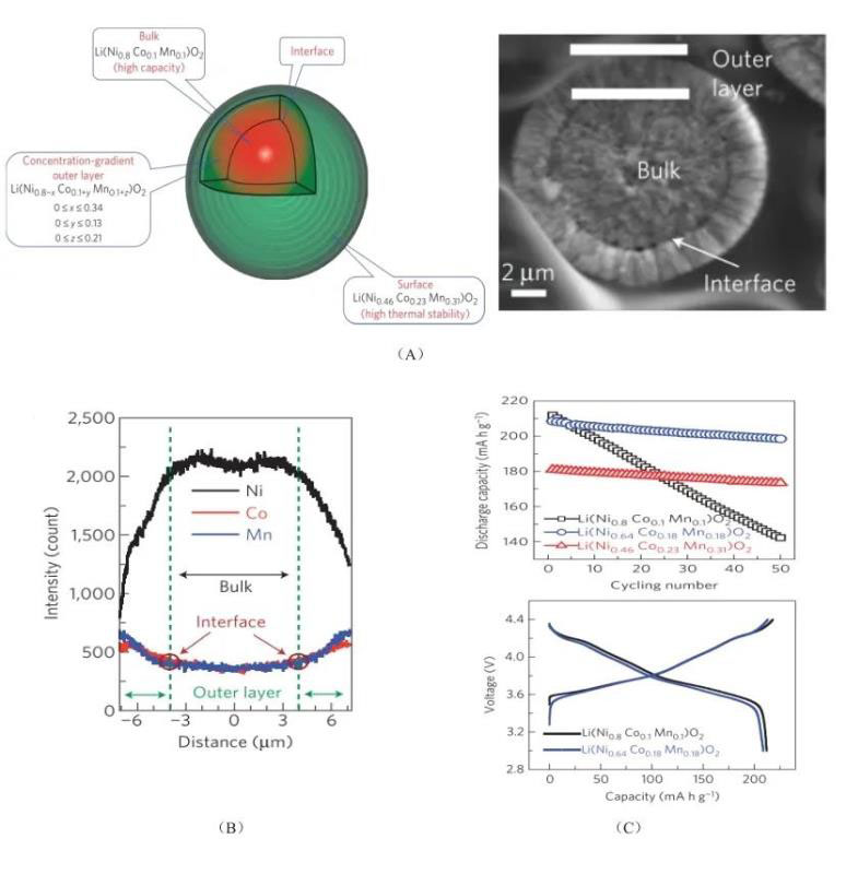 除了直接的元素?fù)诫s外,設(shè)計濃度梯度材料也是一種既能維持材料結(jié)構(gòu)穩(wěn)定性和熱穩(wěn)定性又不犧牲電化學(xué)性能的方法。Yang-Kook Sun等人合成了一種內(nèi)部富Ni外層富Mn的梯度材料,從活性材料顆粒本體中心向外層,其Ni濃度呈梯度降低,而Mn和Co濃度呈梯度增加(圖5(A、B))。其中Ni位于核內(nèi),提供高容量、保證電化學(xué)性能;Mn位于殼上,維持結(jié)構(gòu)穩(wěn)定性和熱穩(wěn)定性(圖5(C))。具有該結(jié)構(gòu)的三元正極材料能夠滿足PHEV中能量密度需求。