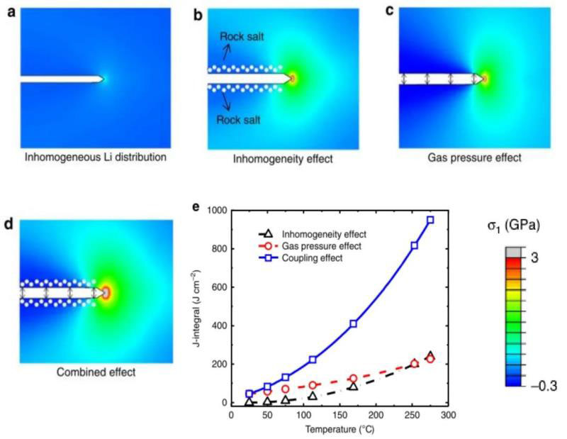 圖4 對NCM622材料裂紋擴(kuò)展驅(qū)動力的多物理場耦合有限元模擬結(jié)果。(a)僅考慮Li+體相濃度分布不均應(yīng)力分布情況;(b)275℃條件下考慮同時考慮Li+濃度分布不均和層狀-巖鹽相相變對應(yīng)力分布的影響;(c) 275℃條件下考慮由氧氣釋放帶來的界面壓力對應(yīng)力分布的影響;(d)當(dāng)(b)、(c)所示情況同時存在時的應(yīng)力