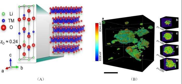 圖3 (A)層狀LiNixCoyMnzO2材料單個晶胞晶體結(jié)構(gòu)示意[18]; (B) (a) 231℃加熱20.5h后單個NCM二次顆粒中等價態(tài)Ni (反應(yīng)面)三維分布圖; (b-e) 單個像素體元Ni價態(tài)隨不同深度分布情況