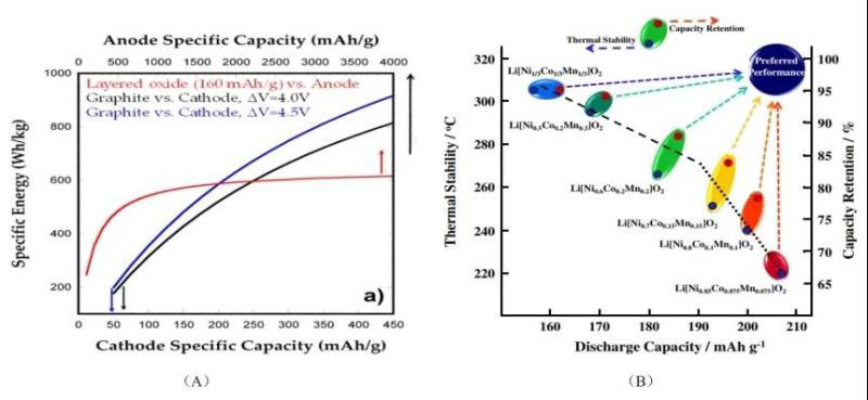 圖1 (A) 僅對正極比容量(黑色曲線)、負(fù)極比容量(紅色曲線)優(yōu)化并在此基礎(chǔ)上提高工作電壓(藍(lán)色曲線)后全電池能量密度變化情況示意圖 (B) 不同Ni、Co、Mn元素含量三元層狀正極材料放電容量、熱穩(wěn)定性、容量保持率綜合比較