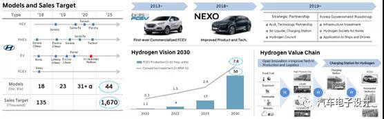 從這個狀態(tài)來看,燃料電池某種意義上也是政府支持的產(chǎn)物。以目前較為激進(jìn)的現(xiàn)代汽車集團(tuán)為例,到2025年的整體規(guī)劃,HEV、PHEV、EV和FCV幾條技術(shù)路線是并行的。2020年的4千臺基本已經(jīng)提前完成了,2025年的規(guī)劃的數(shù)量為1.3萬臺。這個意義上,在一定規(guī)模下發(fā)展燃料電池汽車是有動機(jī)的,但是對現(xiàn)代滿足歐洲、中國的碳排放計(jì)劃,沒有多大的幫助,所以HEV的滲透、PHEV和BEV戰(zhàn)略的發(fā)展都是根據(jù)主要市場來,這條路線是跟著韓國政府配套。