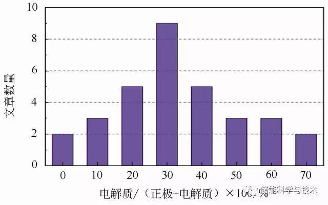 圖3軟包電芯中,正極孔隙率為27%,負(fù)極孔隙率為31%,隔膜孔隙率為40%。正極中,液態(tài)電解質(zhì)占滿(mǎn)了所有孔隙,液態(tài)電解質(zhì)與正極活性物質(zhì)加液態(tài)電解質(zhì)的總質(zhì)量比為7.8%。在2017年發(fā)表的全固態(tài)電解質(zhì)電池的文章中,固態(tài)電解質(zhì)材料與固態(tài)電解質(zhì)加正極活性物質(zhì)總質(zhì)量的比例的文章數(shù)見(jiàn)圖5,可見(jiàn)多數(shù)研究中固體電解質(zhì)的質(zhì)量占比高于10%。這是由于固態(tài)電解質(zhì)材料多以粉體顆粒或薄膜的形式存在于正極中,而且具備不可壓縮性,固態(tài)電解質(zhì)實(shí)際上會(huì)在正極中占據(jù)更多的體積,這樣會(huì)進(jìn)一步降低全固態(tài)鋰電池電芯的質(zhì)量及體積能量密度。