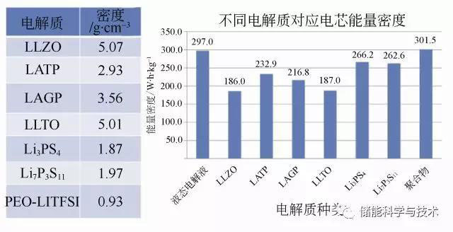 圖表中的縮寫(xiě)意義:LLZO—鋰鑭鋯氧;LATP—磷酸鈦鋁鋰;LAGP—磷酸鍺鋁鋰;LLTO—鋰鑭鈦氧。鋰離子電池的液態(tài)電解質(zhì)密度為1.1 g/cm3。