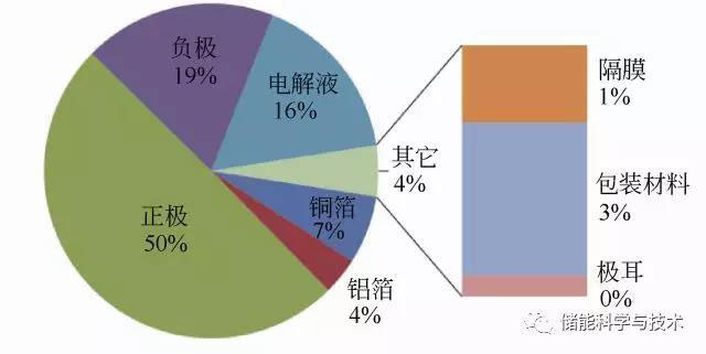 圖3展示了能量密度達(dá)到297 W·h/kg的鋰離子電池軟包電芯的各物質(zhì)占比,液態(tài)電解質(zhì)總共占比16%(質(zhì)量分?jǐn)?shù))。