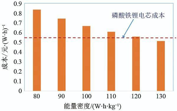 僅從成本上看,鈉離子電池的價格優(yōu)勢主要來源于地殼中較高的鈉儲量(2.36%)(鋰儲量僅為0.002%),以及可以采用相對廉價的鋁替代銅作為集流體等方面,然而這里常常忽視了鈉離子電池相對較低的能量密度,在以能量來計算價格的方式上,低能量密度意味著將付出更多的輔材和制造成本。在主材成本沒有較大優(yōu)勢的前提下,這些輔材和制造成本將拉高電池每瓦時的價格。我們這里可以簡單估算一下,以現(xiàn)在110 A·h磷酸鐵鋰電芯成本(2019 年上半年的數(shù)據(jù))計算(圖 1),其電芯能量密度為 165 W·h/kg,而成本為 0.54 元/(W·h),其 中 正 極 (17.3%)、 負 極 (8.3%)、 電 解 液(6.3%)、銅箔 (9.3%)、鋁箔 (3%)、其他輔件(37.3%)和制造(18.5%),這種類型的電池材料能量密度的實現(xiàn)效率約47%(實際電芯能量密度與以正負極材料計算的能量密度之比)。以現(xiàn)有鈉離子電池正負極材料的比容量、輔件價格和實現(xiàn)效率為基礎(chǔ),并將以后規(guī)模化正負極材料和電解液的價格定為2和2.4萬元/噸,我們可以計算出以硬碳為負極的鈉離子電池(以120 W·h/kg為基礎(chǔ))的成本為0.55 元/(W·h) (圖 1),其中正極 (9.2%)、負極(5%)、電解液(5.6%)、鋁箔(5.6%)、其他輔件(49.9%)和制造(24.7%)。由此可以看出,由于鈉離子電池較低的能量密度,使得其輔材和制造成本可能占到總成本的75%,因此,發(fā)展高能量密度和低價格輔材的鈉離子電池體系,是進一步降低其成本的必然途徑。同時圖2也預估出不同能量密度下的鈉離子電池成本分別為0.51元/(W·h)(130 W·h/kg)、0.55 元/(W·h) (120 W·h/kg)、 0.61 元/(W·h) (110 W·h/kg)和 0.66 元/(W·h)(100 W·h/kg)(注:由于鈉離子電池各原料成本并沒有規(guī)?;漠a(chǎn)品作為參考,且計算成本時為了方便也將正負極材料成本統(tǒng)一固定,這與不同正極材料不同價格不一致,因此這僅是粗略估計,目的是看各組成占總成本的相對比例關(guān)系)。因此,若與2019年上半年磷酸鐵鋰電池對比,鈉離子電池成本的比能量關(guān)鍵點為120 W·h/kg。縱觀現(xiàn)在所研究的正負極材料,實際鈉離子電池要達到120 W·h/kg且需保證儲能所期的長壽命具有一定的挑戰(zhàn)。但我們也需要看到,若正負極材料都采用更廉價和豐富的原料,其成本可能會低于2萬/噸,這時低能量密度鈉離子電池體系也會具有一定的價格優(yōu)勢。