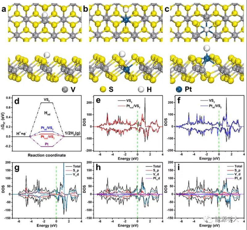 最后,對樣品的催化活性提升進(jìn)行了相關(guān)機(jī)理分析。圖5(a-c)分別為單純VS2,Pt摻雜VS2和Pt吸附VS2的氫原子化學(xué)吸附模型。通過計算可以得到其相應(yīng)的氫吸附自由能如圖5(d)所示,可以發(fā)現(xiàn)Pt的引入,無論是以取代V原子形式存在或是以吸附在VS2表面的形式存在,氫吸附自由能都比單純的VS2和單純的Pt更加接近于熱中性值,更加有利于氫吸附和解吸過程,從而增強(qiáng)電催化析氫性能。同時通過對比DOS也可以發(fā)現(xiàn)(圖5(e-i)),Pt摻雜或吸附后,費(fèi)米面附近的態(tài)密度有所增強(qiáng),意味著能夠有更多的電荷參與到反應(yīng)中,也對于提升電催化析氫活性有所幫助。