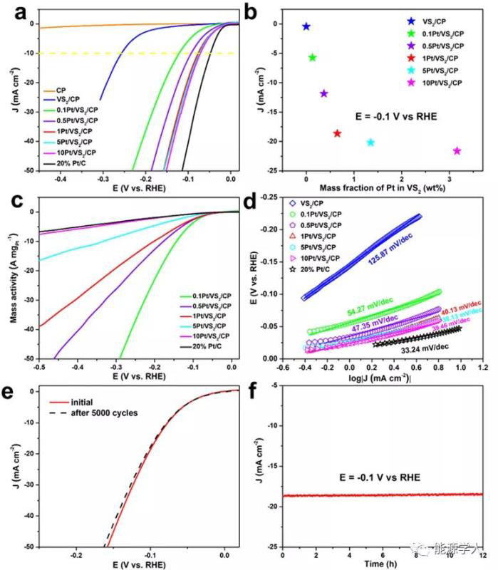 圖4. 0.5M H2SO4為電解液下的HER性能:不同形態(tài)鉑修飾的VS2的(a)LSV曲線;(b)電流隨鉑含量的變化;(c)單位鉑質(zhì)量活性;(d)Tafel斜率。(e)和(f)單原子鉑修飾的VS2催化劑的穩(wěn)定性測試結(jié)果。