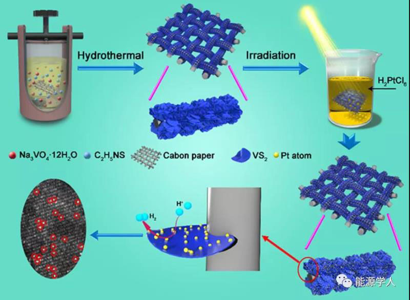 利用VS2為基礎(chǔ)的電催化劑來提高HER的整體性能已有大量研究,但據(jù)我們所知,目前還沒有系統(tǒng)的研究將不同的Pt形態(tài)尤其是單原子Pt加入到VS2中來考察它們對HER的影響。因此,研究人員以VS2為基礎(chǔ)材料,對其進(jìn)行了鉑單原子修飾,從而得到了催化性能十分優(yōu)異且成本低廉的復(fù)合電催化劑材料。首先,通過一步水熱法在碳紙上原位生長了VS2納米片。然后,將長有VS2納米片的碳紙與不同濃度的氯鉑酸溶液充分混合均勻,碳紙兩面分別在氙燈光源下照射一段時間即可得到不同鉑形態(tài)修飾的VS2納米片。通過控制氯鉑酸濃度和照射時間即可得到單原子鉑修飾的二硫化釩催化劑。