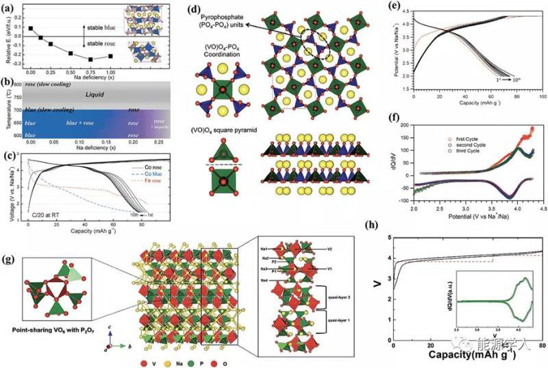 焦磷酸鹽Na2MP2O7(M= Fe,Mn,Co)由于良好的結(jié)構(gòu)穩(wěn)定性,熱穩(wěn)定性和快的鈉離子流動(dòng)性而被廣泛關(guān)注。它們的結(jié)構(gòu)多樣,主要分為:三斜相,四方相和單斜相。一般情況下,Na2FeP2O7和Na2MnP2O7的熱穩(wěn)定相為三斜相,三斜相的Na2MnP2O7可逆容量為80-90 mA h g-1,電壓平臺(tái)約在3.7 V。三斜相的Na2FeP2O7可逆容量約為90 mA h g-1,電壓平臺(tái)在3.0 V左右。因此Na2MnP2O7和Na2FeP2O7的能量密度較低,這嚴(yán)重限制了它們的進(jìn)一步應(yīng)用。Na2CoP2O7的熱力學(xué)穩(wěn)定相為正交相,另外它的晶相與合成的條件(鈉含量,煅燒溫度等)有關(guān),正交晶相的Na2CoP2O7(blue相)平均放電電壓僅有3.0 V。而三斜相的Na2CoP2O7(rose相)工作電壓較高(約為4 V)。圖4展示了Na2CoP2O7的晶相與合成條件之間的關(guān)系以及rose相的電化學(xué)性能。除此之外,Na2(VO)P2O7、Na7V3(P2O7)4等化合物也得到了廣泛研究。目前焦磷酸鹽類(lèi)正極材料一個(gè)主要問(wèn)題是較大的分子量導(dǎo)致它們的可逆比容量很低,難以實(shí)際應(yīng)用。