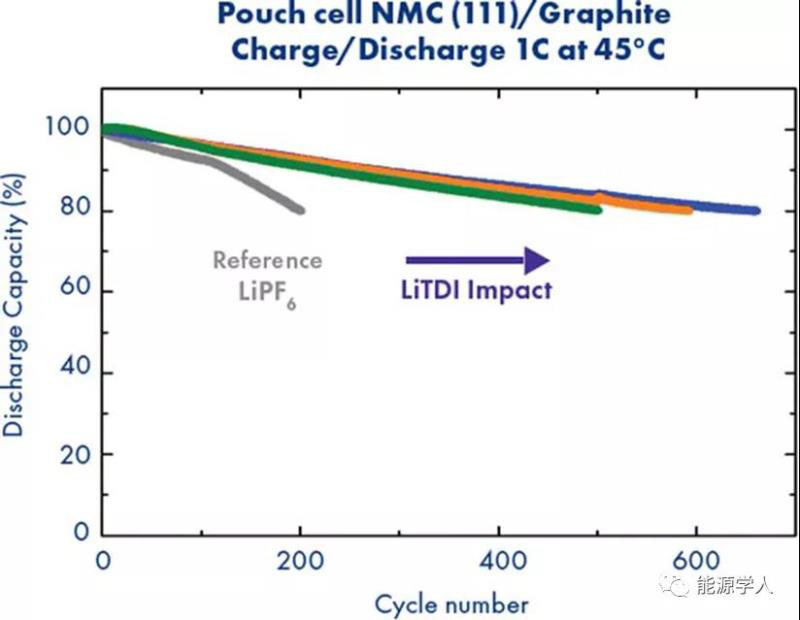 LiTDI的添加通過在SEI形成中發(fā)揮未知作用(無機(jī)電荷或共聚作用)而可以降低整體電池電阻。此外,SEI中LiTDI的存在可以改善循環(huán)壽命,尤其是在高溫下。與魁北克水電公司合作,在含和不含LiTDI的情況下,使用不同電解質(zhì)在軟包電池中(NMC111/石墨)上進(jìn)行了壽命研究,結(jié)果如圖4所示。