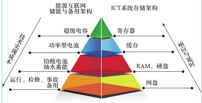 在能源互聯(lián)網(wǎng)中,不同性質(zhì)的能量存儲介質(zhì)適用于不同儲能應用需求?;谀芰啃畔⒒夹g,可以針對不同儲能應用需求,將多種物理化學性質(zhì)迥異的儲能介質(zhì)進行數(shù)字化混用,實現(xiàn)一套物理儲能系統(tǒng)同時滿足多種儲能應用需求,實現(xiàn)儲能系統(tǒng)的價值最大化。值得指出的是,軟件定義數(shù)字復合儲能系統(tǒng)可以從根本上解耦電池系統(tǒng)應用需求與電池單體物理化學特性,在系統(tǒng)應用層面上打破對當前電池應用依賴于電池單體能量密度和功率密度的迷思。為了方便讀者理解這個概念,圖4表述軟件定義數(shù)字復合儲能與信息存儲體系的對照邏輯關系。
