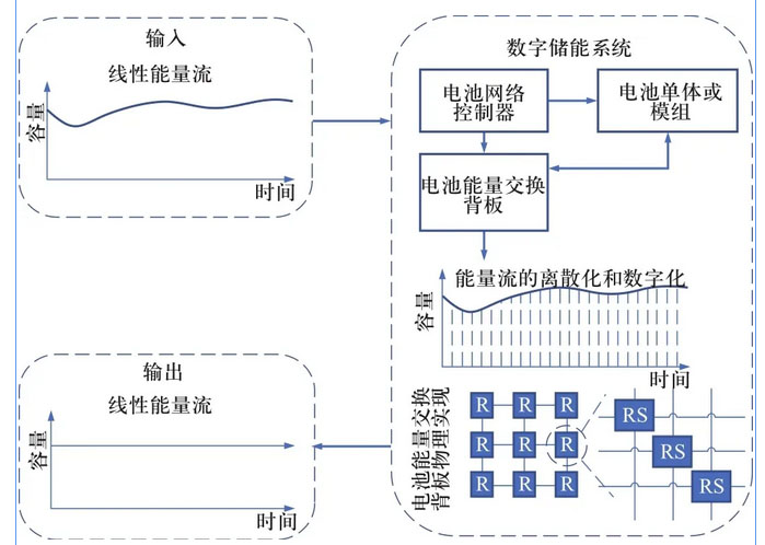在數(shù)字化電池能量交換系統(tǒng)中,模擬能量流被以網(wǎng)絡化連接的高頻MOSFET電力電子開關離散化成為時間序列上的“能量片”(energy slice),離散化后的“能量片”上附加其他信息數(shù)據(jù),如電池資產(chǎn)的所有者、電池電荷狀態(tài)、電池健康狀態(tài)等信息。通過采用程序控制的電池網(wǎng)絡控制器對來自不同電芯的“能量片”進行重組和優(yōu)化,去除電池能量產(chǎn)生和使用過程中的不確定性和非線性,徹底屏蔽了電池物理和化學上的差異性,克服短板效應,進而提升了電池儲能系統(tǒng)性能,可重構電池網(wǎng)絡對電池管理技術的范式創(chuàng)新原理圖如圖1所示。