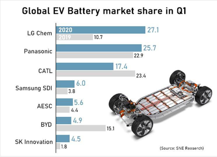 中國儲能網(wǎng)訊:近日,調(diào)研機構SNE Research的最新報告顯示,2020年第一季度全球電動車(EV)電池的使用量中,LG化學以27.1%的市場占有率排名第一。