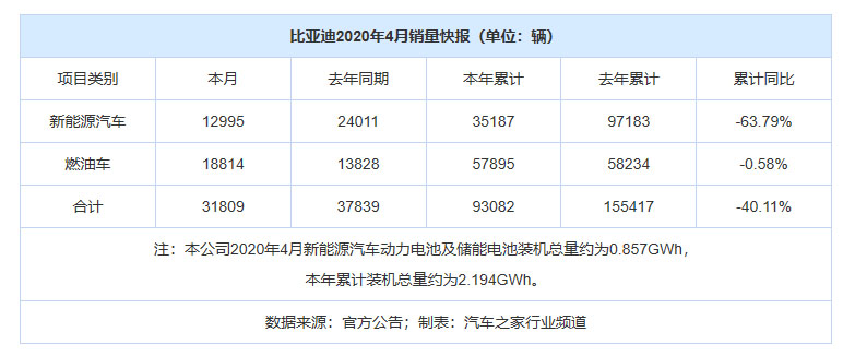 近日,比亞迪發(fā)布2020年4月銷量快報(bào)。公告顯示,比亞迪4月共銷售新車31809輛,相比去年同期下滑15.9%,2020年1-4月累計(jì)銷量達(dá)到93082輛,同比下滑40.1%。