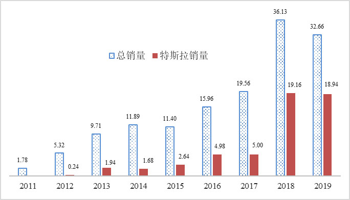 圖1 美國(guó)歷年BEV和PHEV總銷量及特斯拉銷量(萬(wàn)輛)