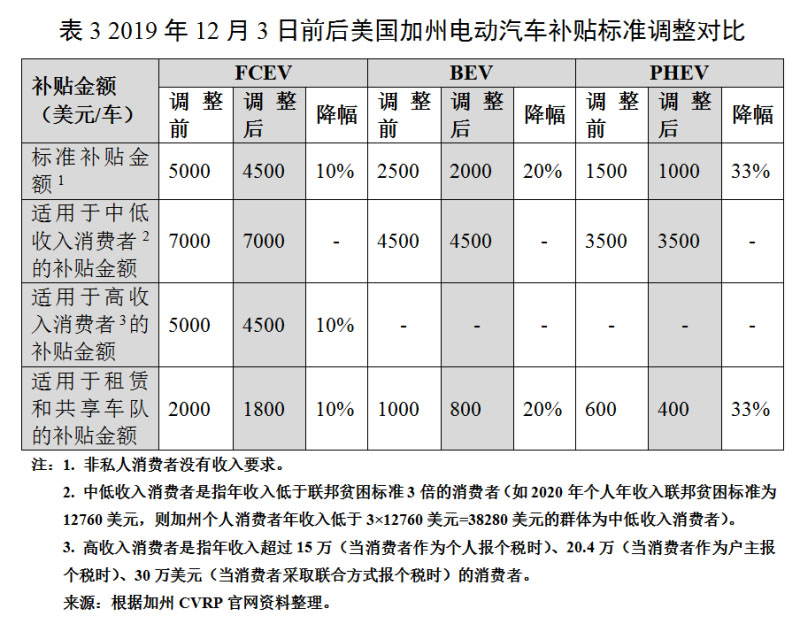 2019年底加州對(duì)CVRP進(jìn)行了新一輪調(diào)整:補(bǔ)貼金額退坡、技術(shù)門檻提高。2014年以來(lái),CVRP政策雖屢次調(diào)整,但單車標(biāo)準(zhǔn)補(bǔ)貼金額基本維持不變。然而隨著加州電動(dòng)汽車市場(chǎng)規(guī)模增長(zhǎng),補(bǔ)貼申請(qǐng)需求大幅增加,項(xiàng)目預(yù)算往往無(wú)法支撐到每財(cái)年結(jié)束,為減緩預(yù)算資金的消耗速度,使更多需要補(bǔ)貼資金的人受惠,從而實(shí)現(xiàn)更有意義的市場(chǎng)激勵(lì)效果,CARB對(duì)CVRP政策進(jìn)行了修改,并于2019年12月3日起實(shí)施:一是下調(diào)單車補(bǔ)貼金額。針對(duì)私人消費(fèi)者(除低收入群體外)的標(biāo)準(zhǔn)單車補(bǔ)貼金額統(tǒng)一下調(diào)500美元;針對(duì)租賃和共享車隊(duì)申請(qǐng)者的單車補(bǔ)貼金額統(tǒng)一下調(diào)200美元。二是限制車價(jià)。除FCEV以外,廠商指導(dǎo)價(jià)超過(guò)6萬(wàn)美元的車型(如特斯拉Model S和Model X)自2019年12月3日起不再享受補(bǔ)貼。三是提高技術(shù)門檻。PHEV純電續(xù)駛里程要求由20英里提升至35英里(約56公里)。四是加嚴(yán)申請(qǐng)次數(shù)限制。非租賃和共享車隊(duì)消費(fèi)者,享受補(bǔ)貼的次數(shù)上限由2次降低為1次。