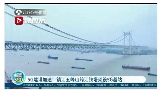 馮源江蘇臺記者說:“這里是位于鎮(zhèn)江新區(qū)的五峰山長江大橋跨江鐵塔上,我現(xiàn)在所處的高度大概距離長江江面65米,也是五峰山長江大橋橋面距離江面的高度。在我身后,工人師傅正在鐵塔上架設(shè)5G通信基站,這也是首個(gè)架設(shè)在跨江鐵塔之上的5G基站。”