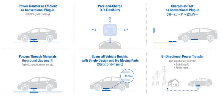 根據(jù)WiTricity官網(wǎng)顯示,該公司的無(wú)線充電技術(shù)能夠?qū)崿F(xiàn)接近常規(guī)家用充電樁的充電效率和速度,其從電網(wǎng)到電池的充電效率將達(dá)到90%-93%;充電功率將能夠達(dá)到3.6-11kW,甚至更高;其地面的發(fā)射端與車輛的接收端保持的工作距離可以達(dá)到10-25厘米,對(duì)于絕大部分的純電動(dòng)跑車、轎車以及SUV都能正常適配。