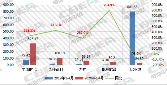 圖:2020年1-4月動力電池裝機量排名前五企業(yè)分析;數(shù)據(jù)來源:動力電池應(yīng)用分會研究部