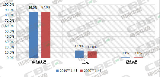 圖:2020年1-4月專用車搭載動力電池占比分析;數(shù)據(jù)來源:動力電池應(yīng)用分會研究部