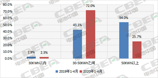 圖:2020年1-4月專用車帶電量分布;數(shù)據(jù)來源:動力電池應(yīng)用分會研究部