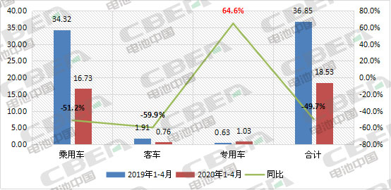 動力電池應(yīng)用分會研究部統(tǒng)計的數(shù)據(jù)顯示,2020年1-4月新能源汽車產(chǎn)量累計18.53萬輛,同比下滑49.7%;搭載的動力電池裝機量9.28GWh,同比下降47.6%。其中,新能源專用車產(chǎn)量累計1.03萬輛,同比增長64.6%,搭載的動力電池裝機量0.63GWh,同比下降40.9%。