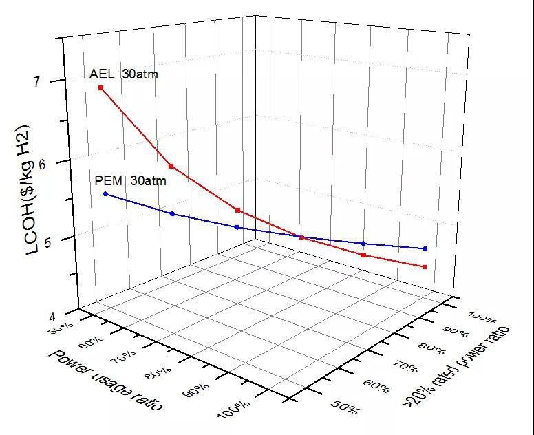 增加制氫裝置規(guī)模、提高電解制氫出口壓力可降低氫氣的平準化成本;在波動性功率輸入時,適應(yīng)低負載及過載的電解技術(shù)優(yōu)勢更加明顯。隨著堿性與PEM電解技術(shù)的不斷進步,二者的制氫成本優(yōu)劣需針對實際應(yīng)用情況進行全面分析,以獲得最具經(jīng)濟性的可再生能源制氫方案。