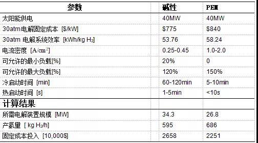 低于堿性電解裝置要求的最小負載20%的電量,無法使其啟動,而這部分能量在PEM電解中可以利用起來;PEM電解允許的最大負載為150%,而堿性電解裝置允許的最大負載為120%,40MW太陽能發(fā)電需要配套34.3MW堿性電解裝置,如配套PEM電解裝置則僅需26.8MW。