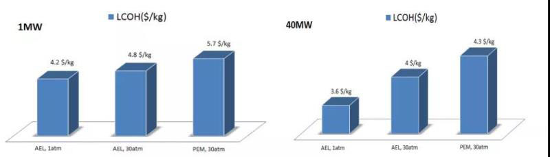圖2 1MW與40MW規(guī)模下不同電解技術(shù)制氫成本比較