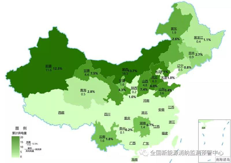 截至3月底各地區(qū)累計(jì)棄風(fēng)電量(億千瓦時(shí))及棄風(fēng)率