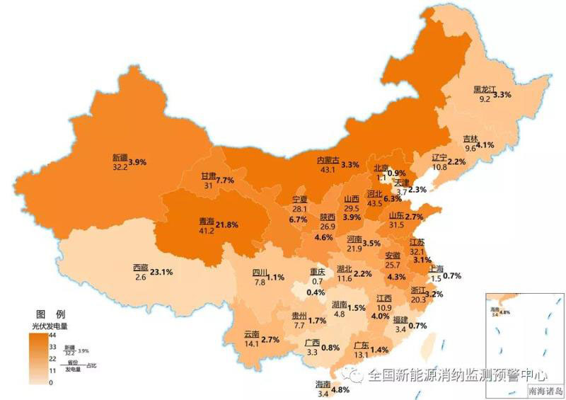截至3月底各地區(qū)累計(jì)光伏發(fā)電量(億千瓦時(shí))及占本地區(qū)總發(fā)電量比重