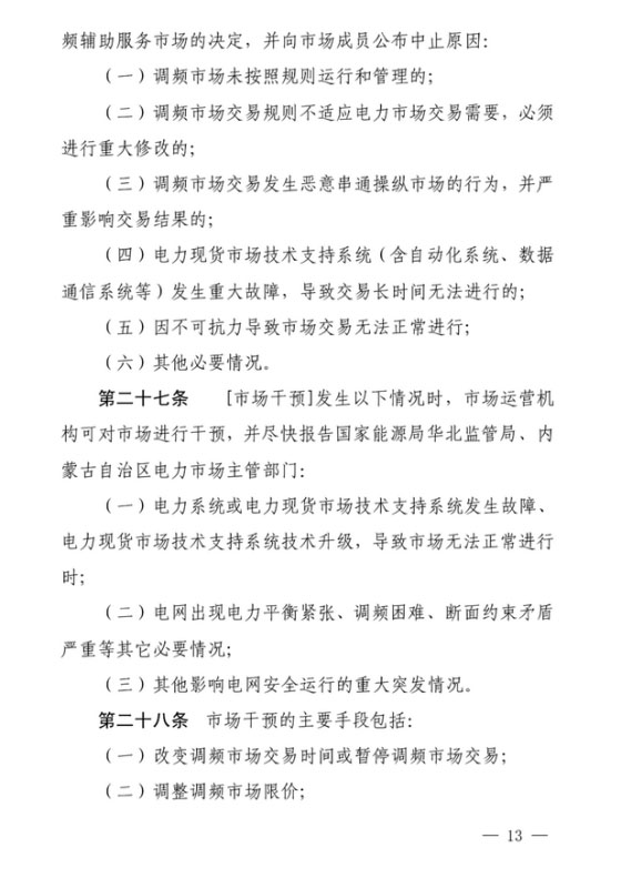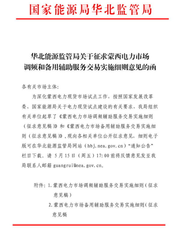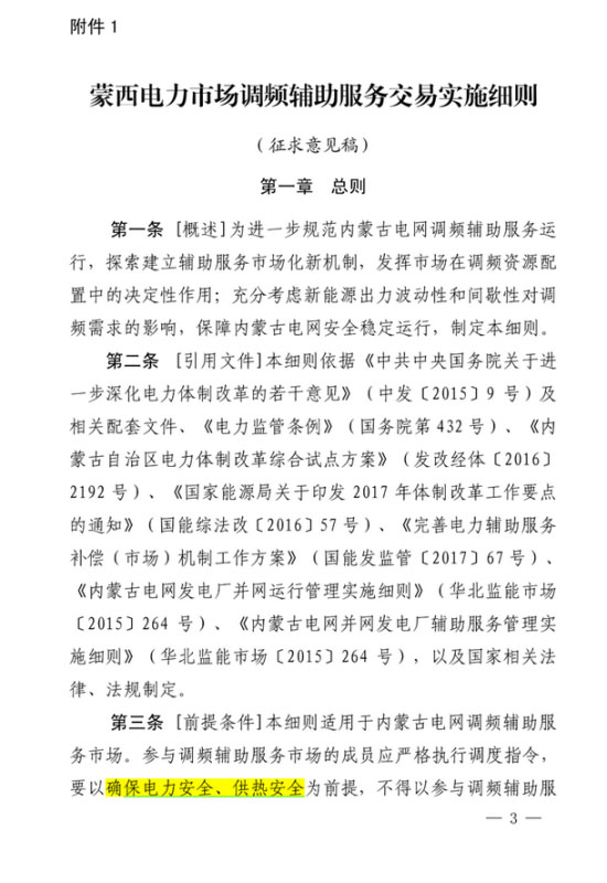 近日,華北能監(jiān)局發(fā)布《蒙西電力市場調(diào)頻和備用輔助服務(wù)交易實施細(xì)則征求意見稿》。