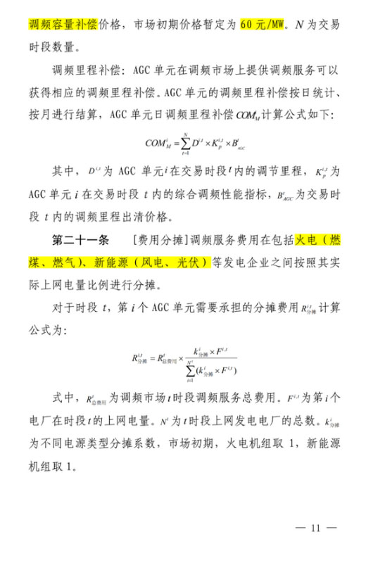 調(diào)頻服務(wù)費用在包括火電(燃煤、燃?xì)猓⑿履茉矗L(fēng)電、光伏)等發(fā)電企業(yè)之間按照其實際上網(wǎng)電量比例進(jìn)行分?jǐn)偂?