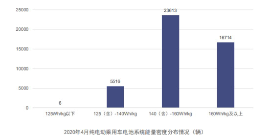 從電池系統(tǒng)能量密度分布來看,2020年4月,我國純電動乘用車系統(tǒng)能量密度在125(含)-140Wh/kg車型產(chǎn)量占純電動乘用車總產(chǎn)量比例12.0%,較3月份提升4.5個百分點,140(含)-160Wh/kg和160Wh/kg及以上車型產(chǎn)量占比分別為51.5%和36.5%。