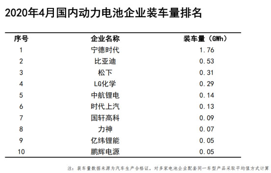 此外,2020年1-4月,我國動力電池裝車量排名前十的企業(yè)分別是寧德時代、比亞迪、松下、LG化學(xué)、國軒高科、中航鋰電、億緯鋰能、力神電池、時代上汽、塔菲爾新能源。