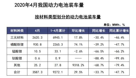 此外,2020年1-4月,我國三元電池裝車量累計為6.9GWh,占總裝車量74.9%,同比累計下降46.4%;磷酸鐵鋰電池裝車量累計為2.3GWh,占總裝車量的24.4%,同比累計下降47.7%。