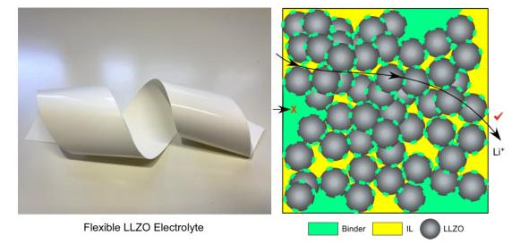 因此,東京都立大學(xué)的一個(gè)研究小組在Kiyoshi Kanamura教授的領(lǐng)導(dǎo)下,開(kāi)始研發(fā)一種能夠在室溫下制作的柔性復(fù)合LLZO片狀電解質(zhì)。研究人員在薄薄的聚合物基材上澆上LLZO陶瓷泥漿,就像在吐司上涂上黃油一樣。然后,再放到真空爐中進(jìn)行干燥,之后,該款75微米厚的片狀電解質(zhì)會(huì)被浸泡到離子液體(IL)中,以提升其離子電導(dǎo)率。離子液體就是室溫下的液體鹽,眾所周知,其導(dǎo)電率高,而且?guī)缀醪灰兹?,也不揮發(fā)。在該片狀電解質(zhì)內(nèi)部,離子液體成功填補(bǔ)了結(jié)構(gòu)中的微小缺口,橋接了LLZO顆粒,為鋰離子形成一個(gè)有效通道;此外,還有效降低了陰極接觸界面的電阻。在進(jìn)一步研究中,研究人員發(fā)現(xiàn),結(jié)構(gòu)中的鋰離子既在離子液體,也在LLZO顆粒中擴(kuò)散,因而離子液體和LLZO顆粒都突出發(fā)揮了作用。該合成法非常簡(jiǎn)單,適合工業(yè)化生產(chǎn),而且整個(gè)過(guò)程都在室溫下進(jìn)行,無(wú)需高溫?zé)Y(jié)。