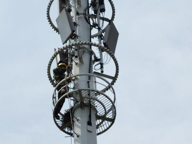 “今天這個基站周邊比較平整,算是比較好作業(yè)的了。”龔輝和工友要安裝設備的鐵塔有45米高,旁邊就是機房。塔工綁好安全繩,便開始往塔頂攀爬,不到3分鐘就爬上去了。在塔頂,塔工要搭建好滑輪,然后通過牽引繩把3個設備拉上去。