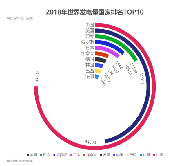 但到了2018年,中國發(fā)電量高達(dá)7萬億千瓦時,位列全球第一,十六年間增長近10倍。位列第二的是美國,發(fā)電量為4.46萬億千瓦時,僅增長約1.4萬億千瓦時。