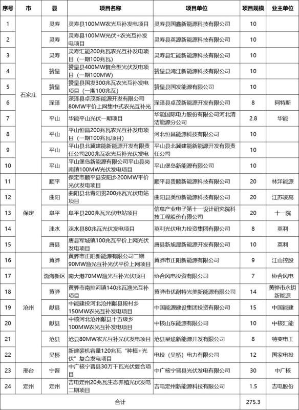 5月15日,河北發(fā)改委公示2020年平價光伏發(fā)電項目擬安排情況,共有24個項目,共計275.3萬千瓦進入該名單。